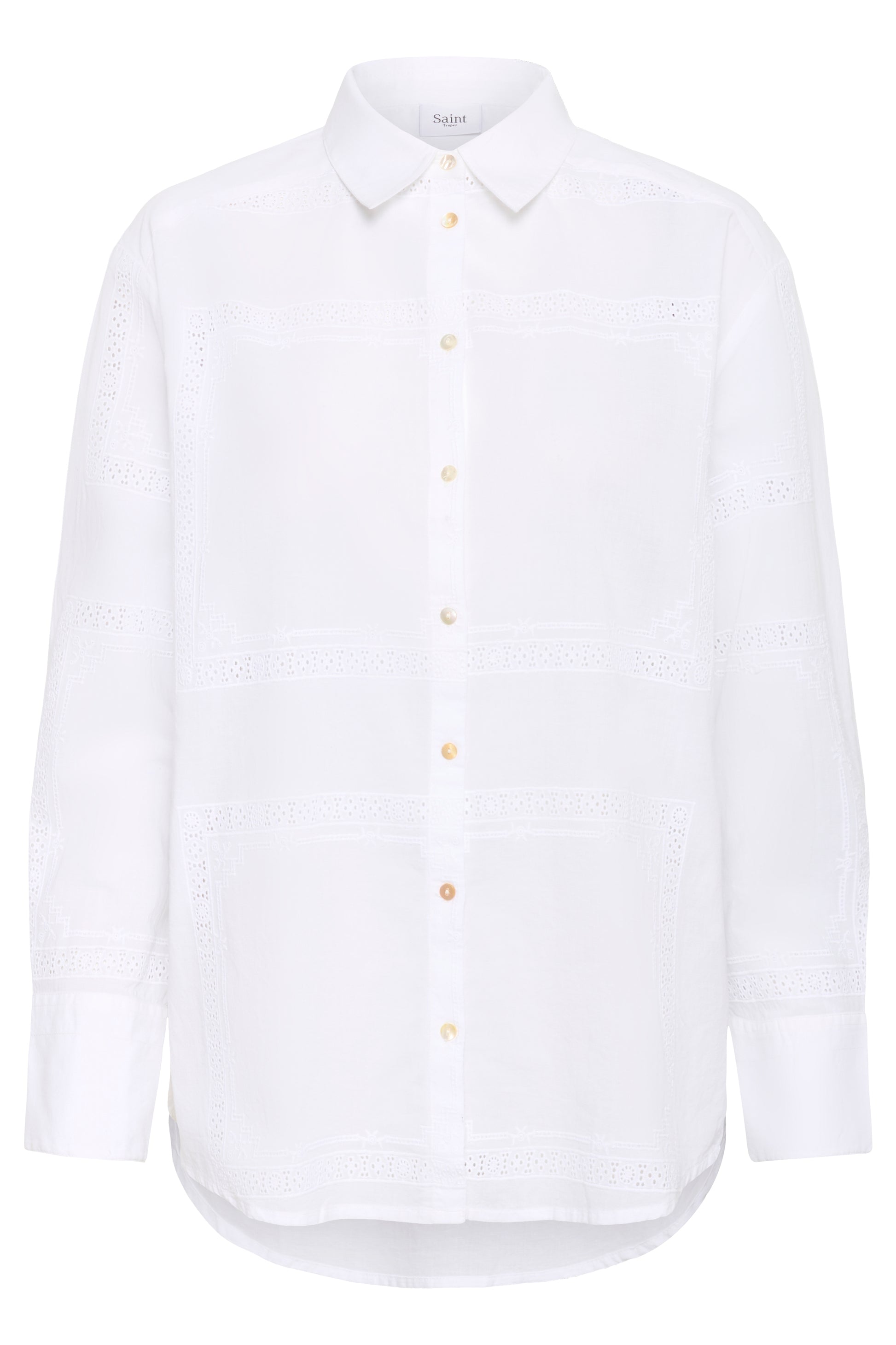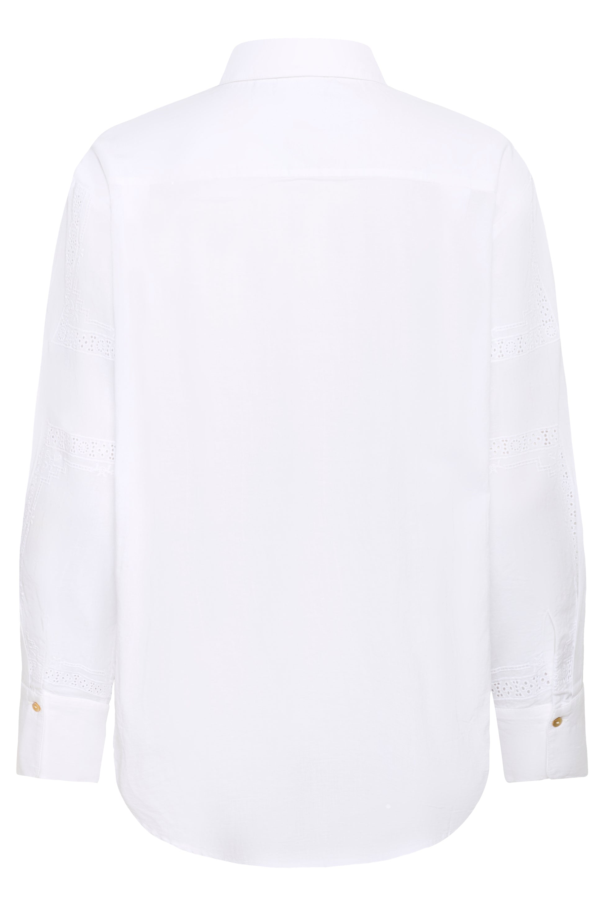 Women's blouse with classic shirt collar, long sleeves, and relaxed fit. Features delicate lace inserts, button front, and straight hem. Suitable for both office and casual wear, providing versatile style and comfort.