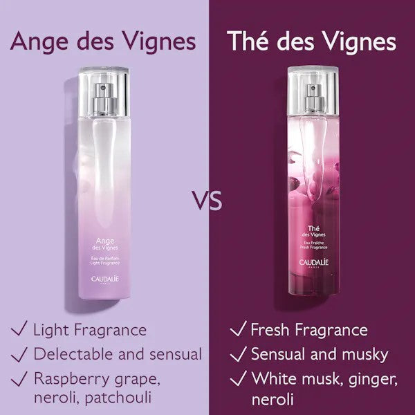 Caudalie presents its first Light Fragrance, Ange des Vignes, with both sensual and sparkling notes. Its warm, chypre fragrance offers fruity notes of raspberry grape, light notes of neroli and enveloping notes of patchouli. Its bewitching and sensual fragrance offers the heavenly freshness found between the sky and the vines.