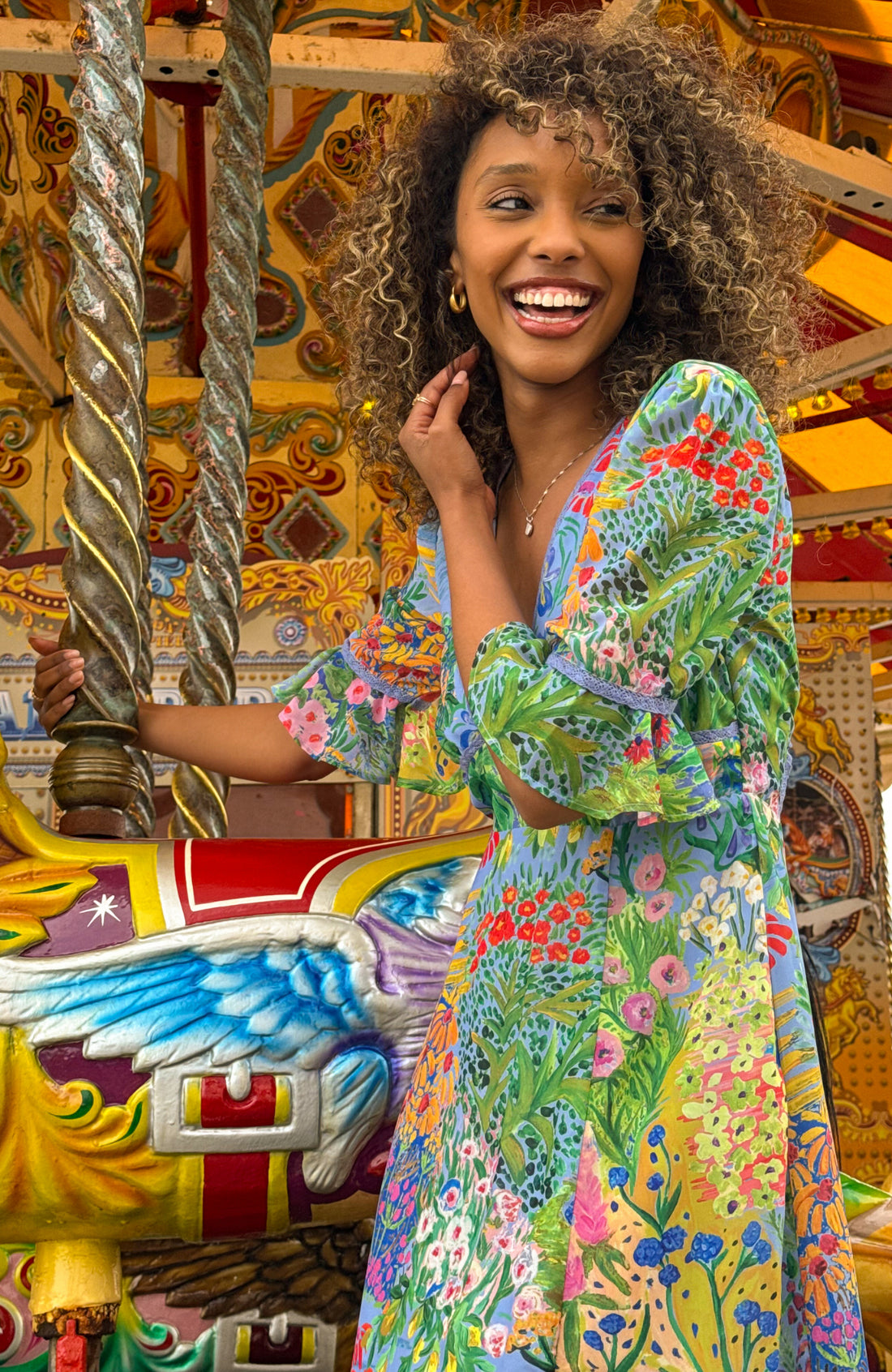 Featuring a hand-designed print in perfect shades of blue, pink and green, this dress comes complete with elegant lace detailing at the neckline and waist, plus a dramatic, maxi, thigh split skirt. A sublime choice for all your upcoming summer occasions.
