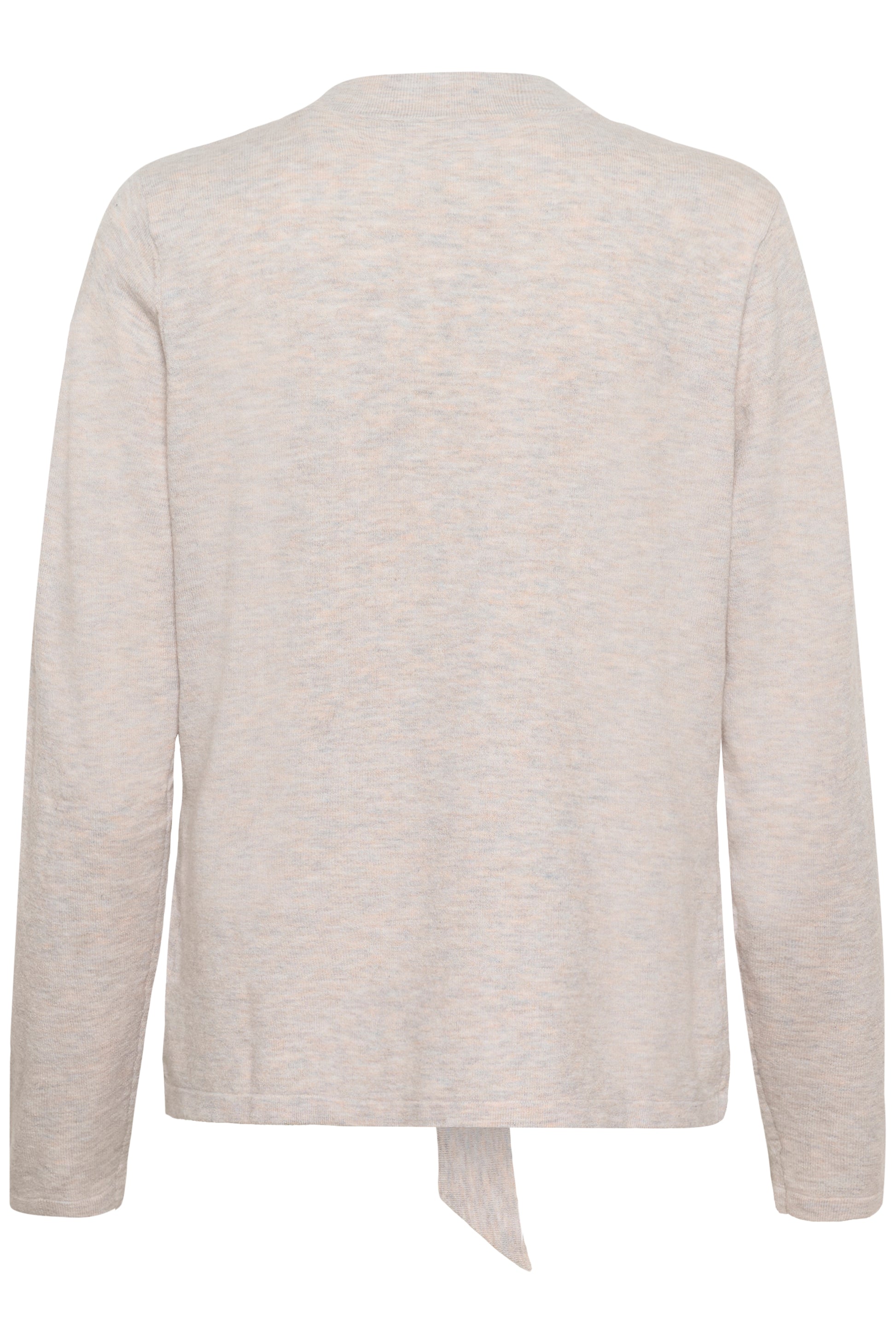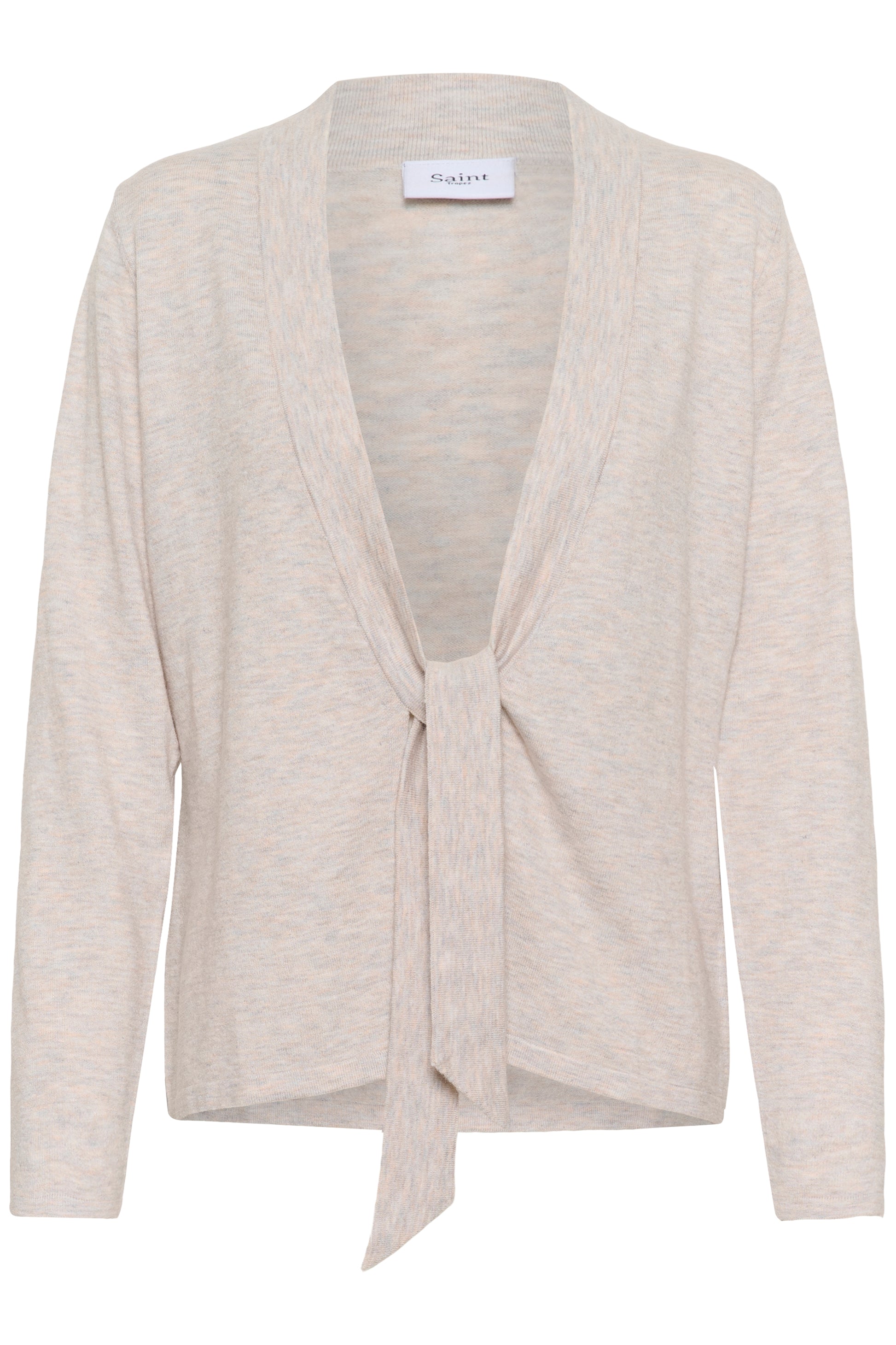 This tie-front cardigan features a straight fit with long sleeves, a deep V-neckline, and a soft, smooth appearance. The front is secured with an attached fabric tie, creating a clean and minimal silhouette.