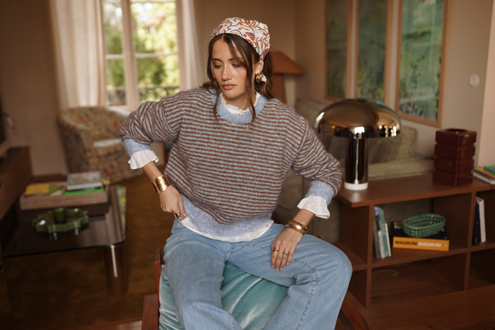 A striped knit with graphic charm, warmed by natural tones and a soft texture. The contrasting round neck and ribbed trims structure the silhouette, while the soft volume brings a casual and contemporary look.